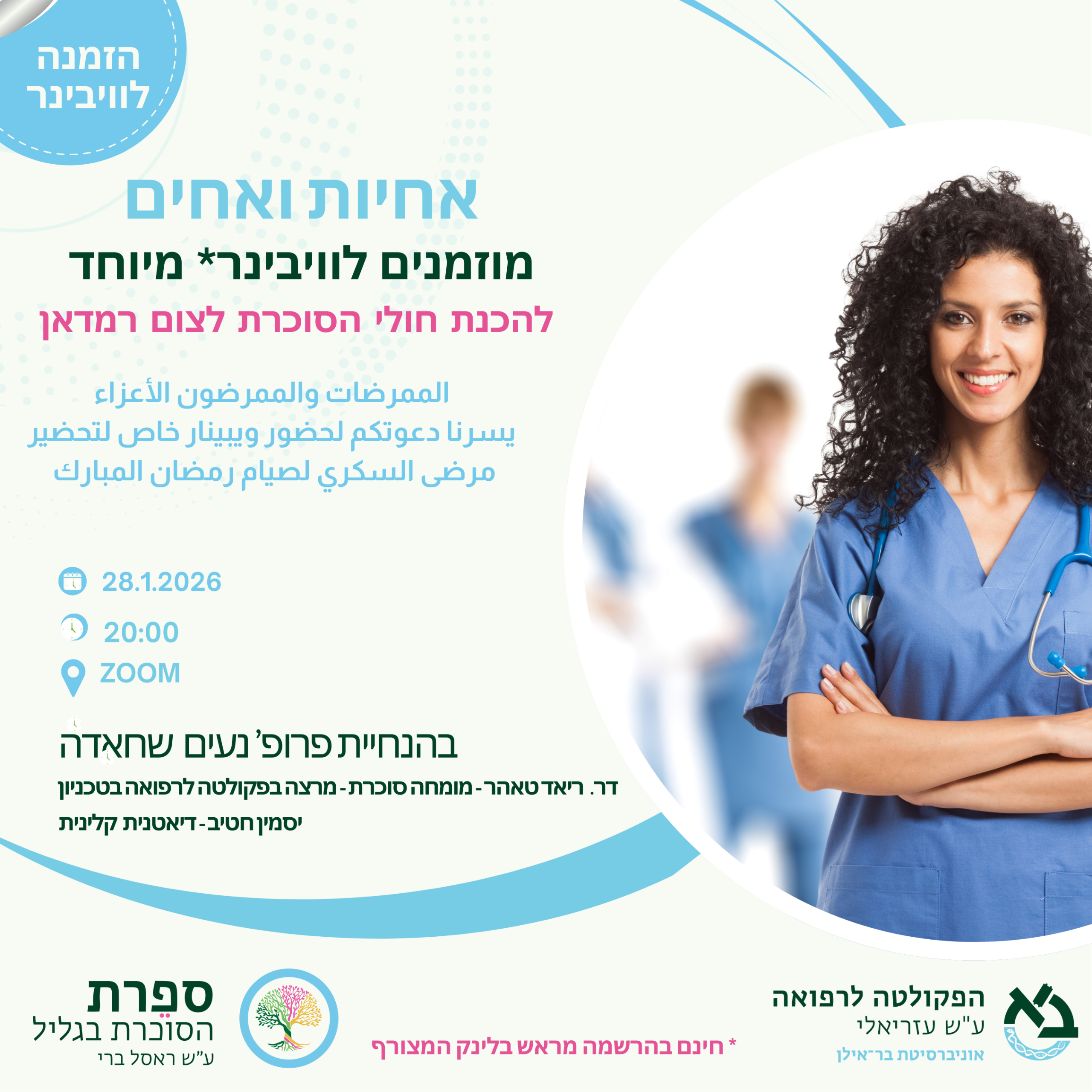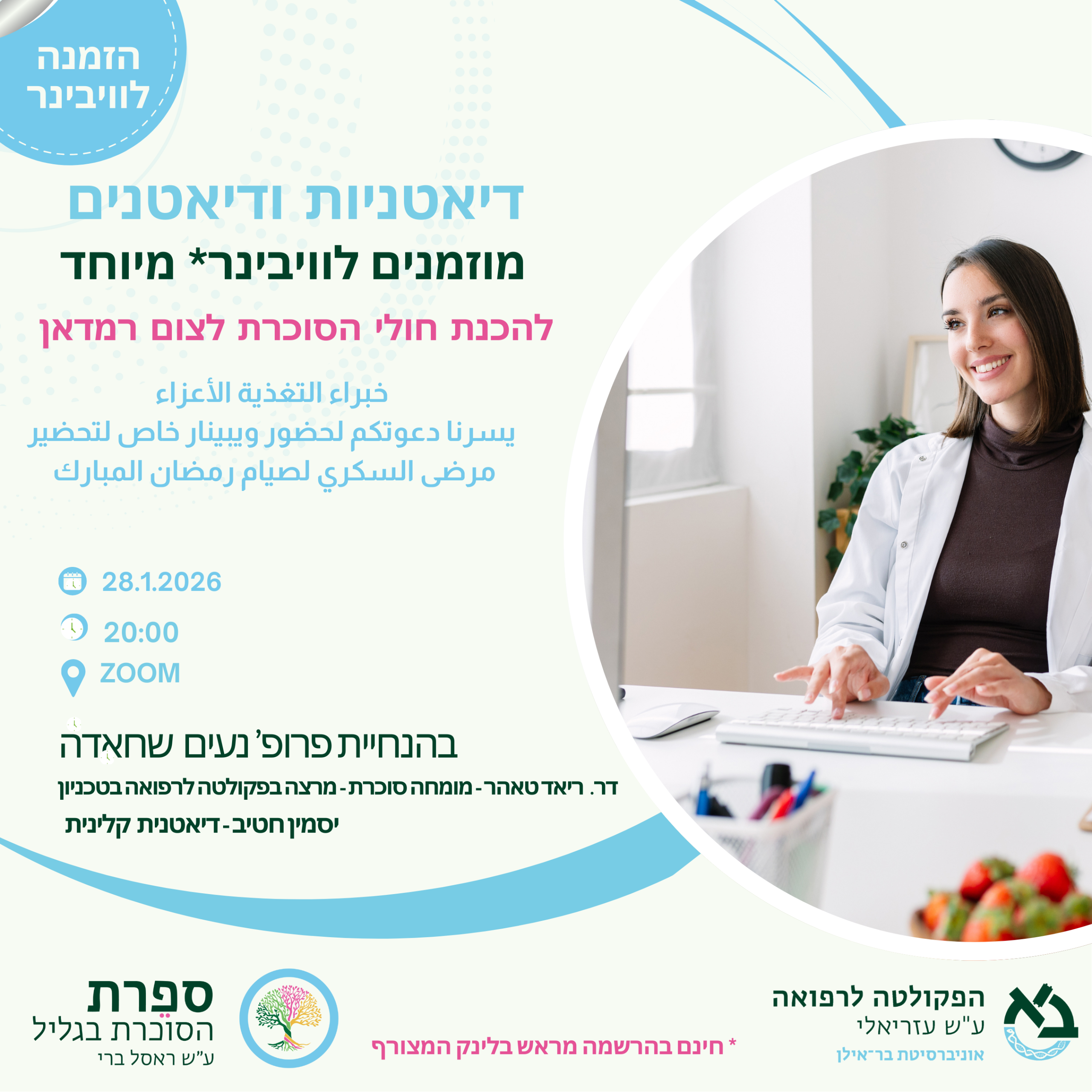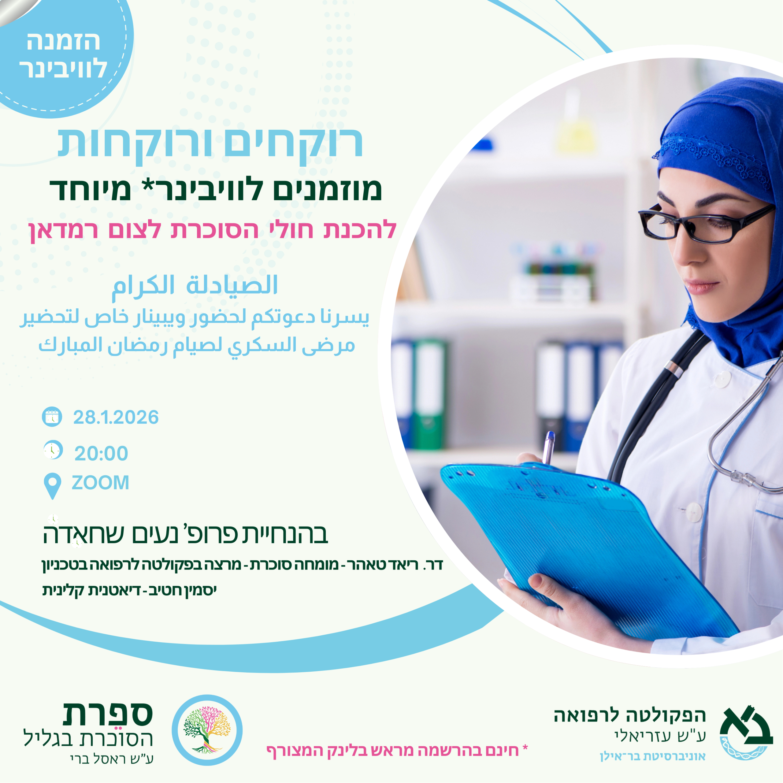 בהובלת פרופ נעים שחאדה, בשיתוף דר ריאד טאהר, ויסמין חטיב נערך לאחרונה ווביניר מיוחד להכנת הקהילה הרפואית לטיפול בחולי סוכרת בתקופת צום חודש הרמדאן שהחל השנה ב 17 בפברואר. התפיסה הרווחת בספרה הנה ההזדמנות הגלומה בחודש הרמדאן לאימוץ הרגלים בריאים יותר.